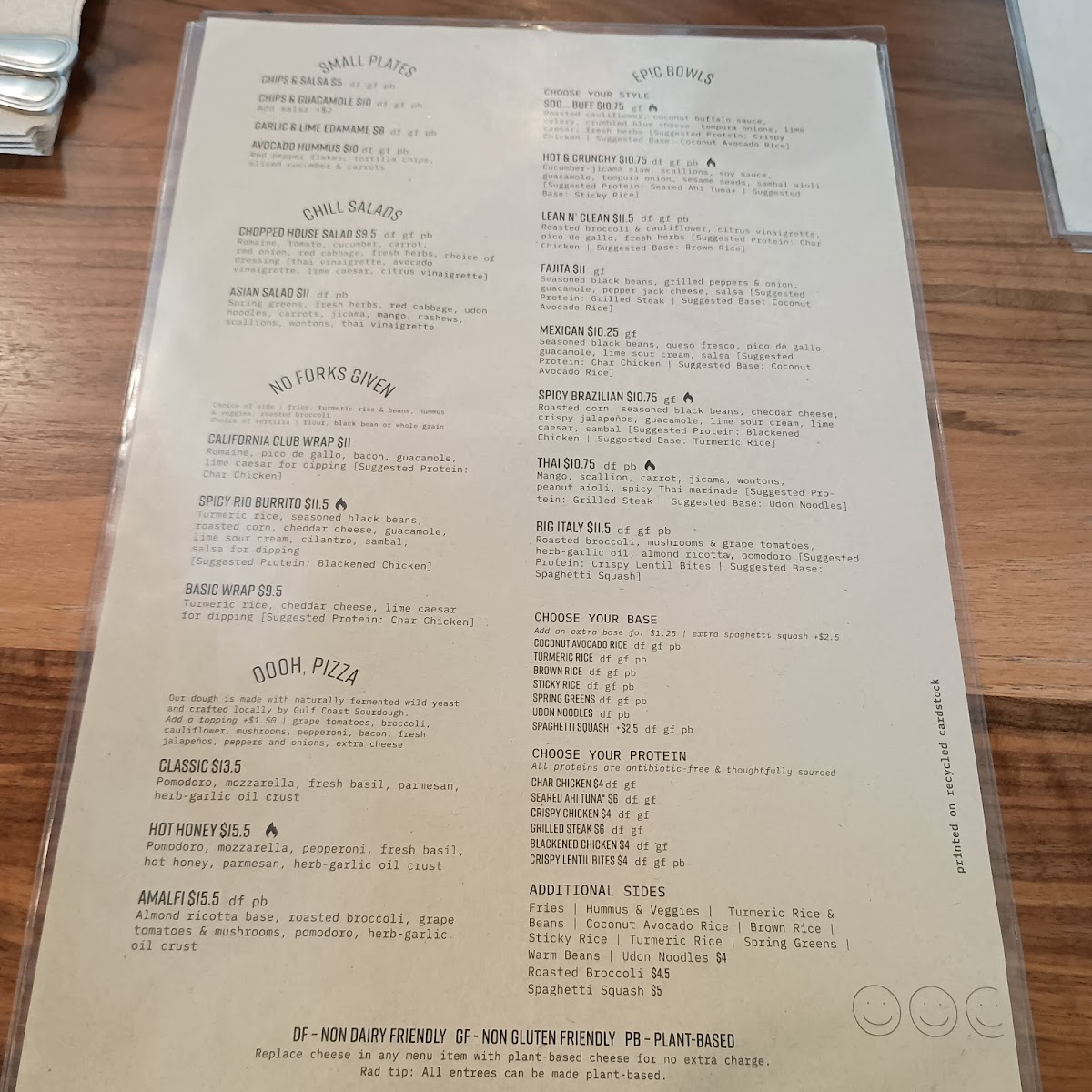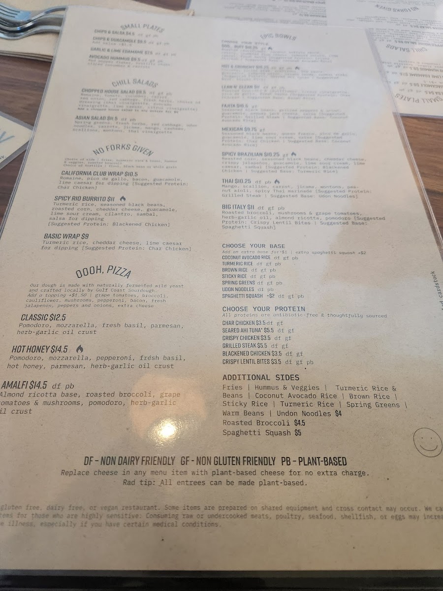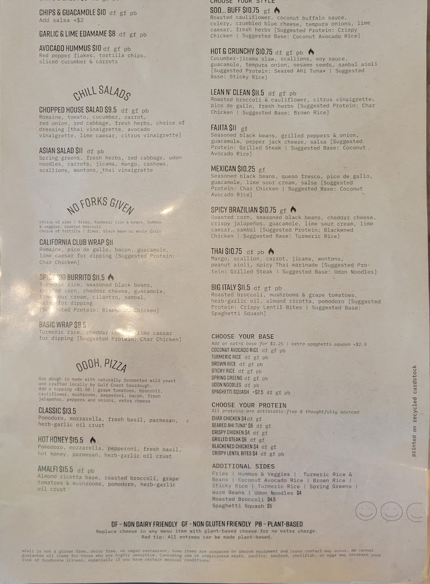Char chicken [steak or tuna +$3], turmeric rice, cheddar cheese, lime ceasar for dipping | locally sourced flour tortilla], choice of side [Tater tots, Rice & Beans, Spring Greens, Roasted broccoli]